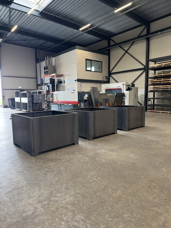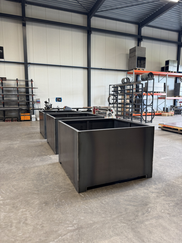 De bovenzijde is dubbel omgezet (50–30 mm), wat zorgt voor extra stevigheid en een strakke afwerking. De bodem is 20 mm verdiept vastgelast en voorzien van voldoende afwateringsgaten (ø 20 mm) voor een optimale waterafvoer. De plantenbak is standaard uitgerust met vier poten van 70 mm hoog, waardoor hij eenvoudig met een heftruck kan worden verplaatst.