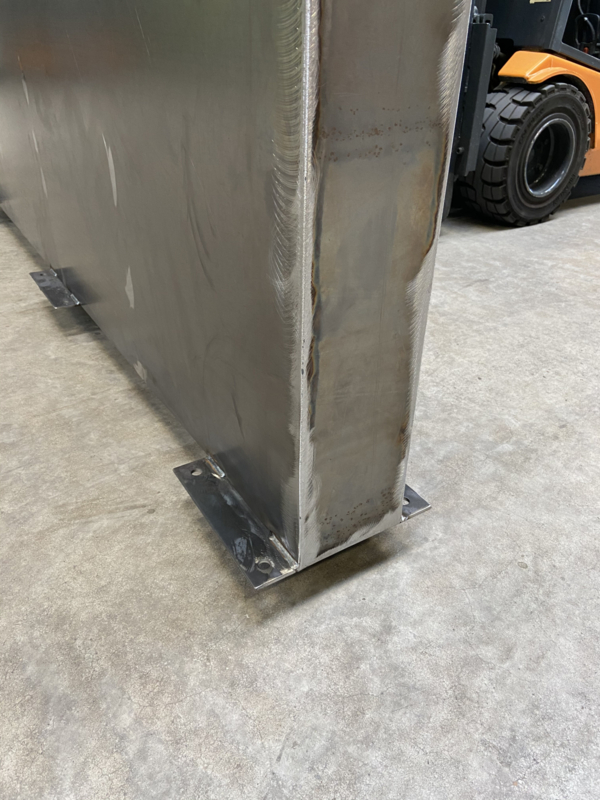 Aan de binnenzijde wordt de constructie verstevigd met schetsplaten, wat zorgt voor extra stabiliteit. Alle hoeken zijn volledig afgelast met originele CORTEN-A LNM28 lasdraad en zorgvuldig nageslepen voor een strak eindresultaat.